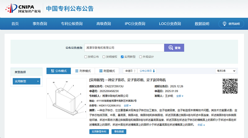 近日,湘潭華聯(lián)電機(jī)有限公司自主研發(fā)的“一種定子鐵芯、定子鐵芯組、定子及其電機(jī)”技術(shù),成功獲得國(guó)家知識(shí)產(chǎn)權(quán)局授權(quán),專利號(hào)為CN223729513U。此項(xiàng)專利于2025年1月正式提出申請(qǐng),2025年12月26日授權(quán)公告,標(biāo)志著公司在電機(jī)核心零部件設(shè)計(jì)領(lǐng)域取得了新的突破。